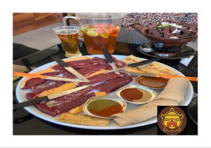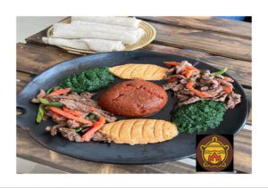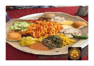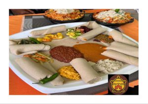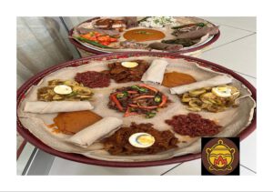 • A variety of traditional vegan side dishes like Shiro, lentils, potatoes, cabbage, vegetables, and salad served on Injera.