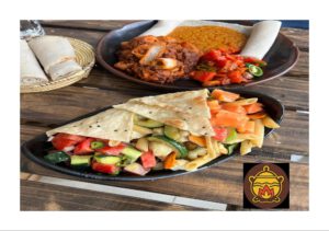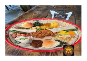 • Colorful vegan fast food plate with various vegetables, lentils, Shiro, and sauces – served with Injera.